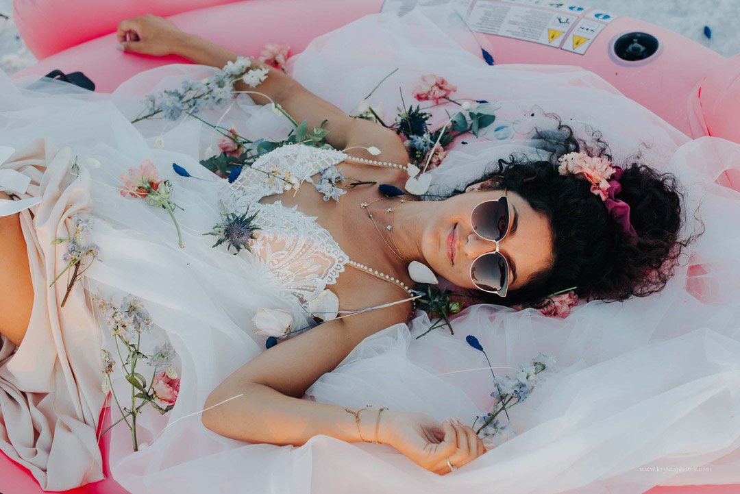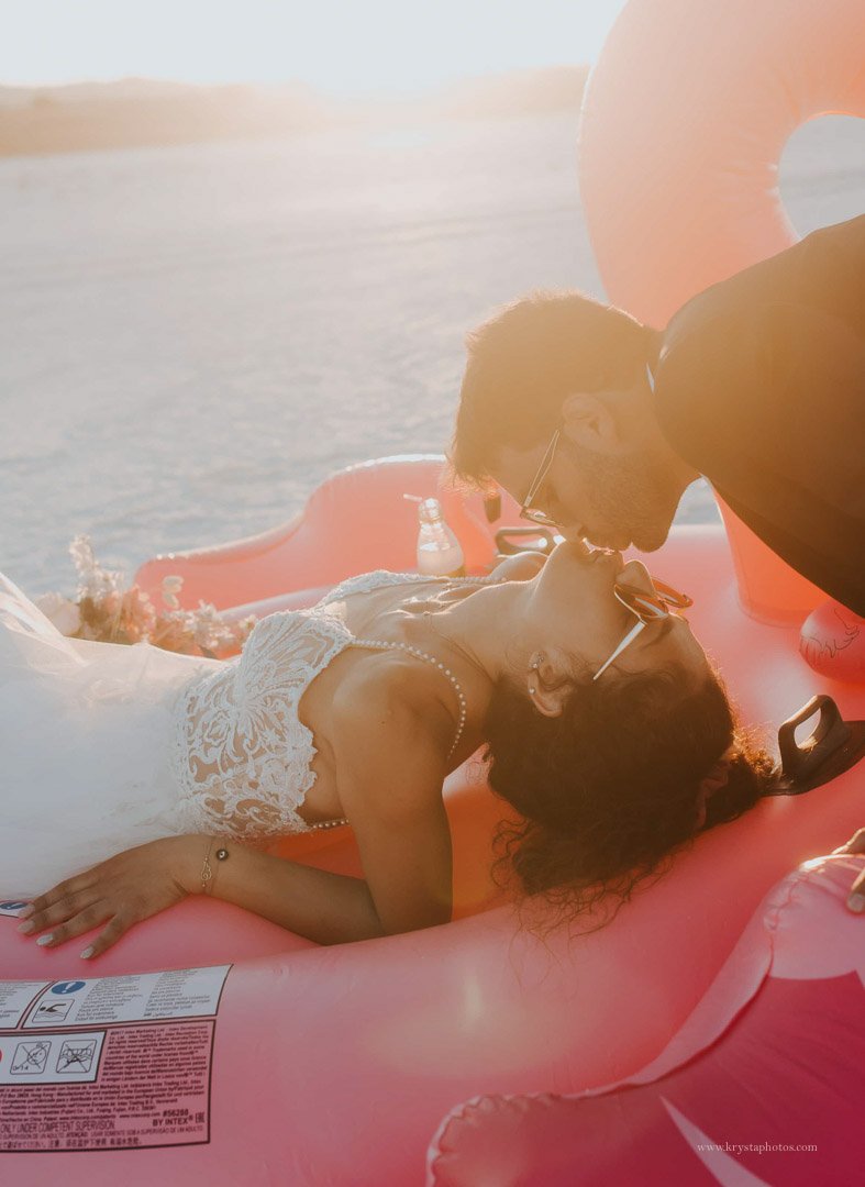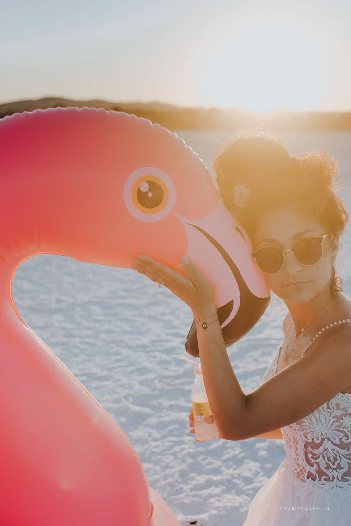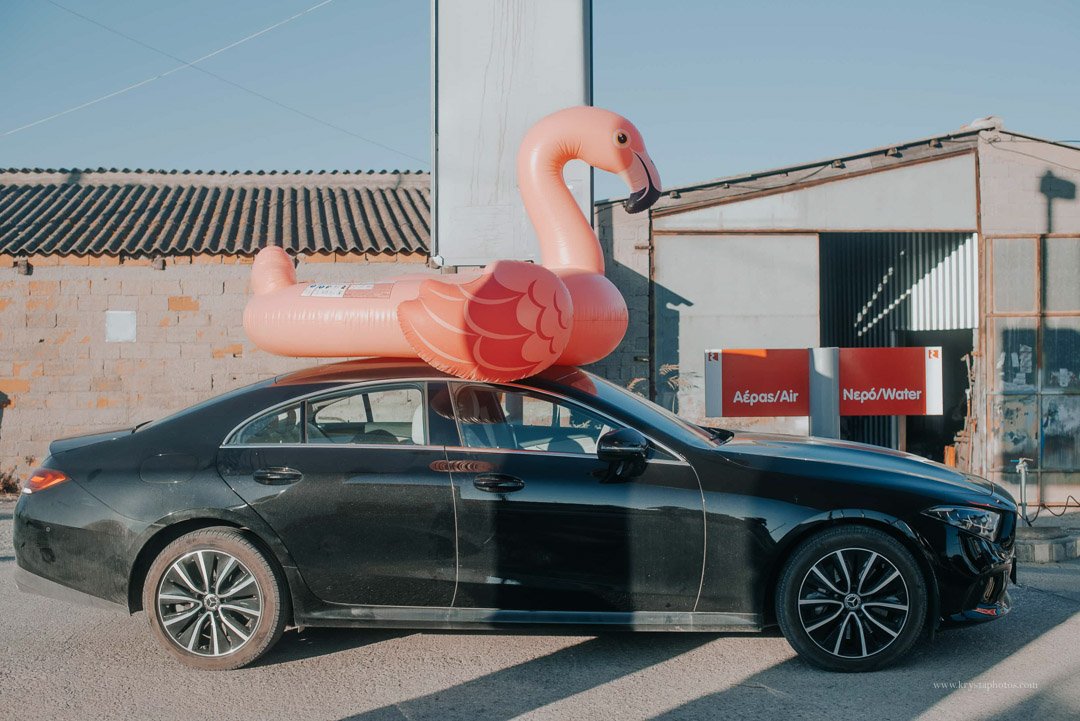 We did forget the pump (oops), but that turned into one of my favorite moments: the bride, chill and unbothered, munching on a Magnum ice cream at a gas station while we filled up the flamingo.